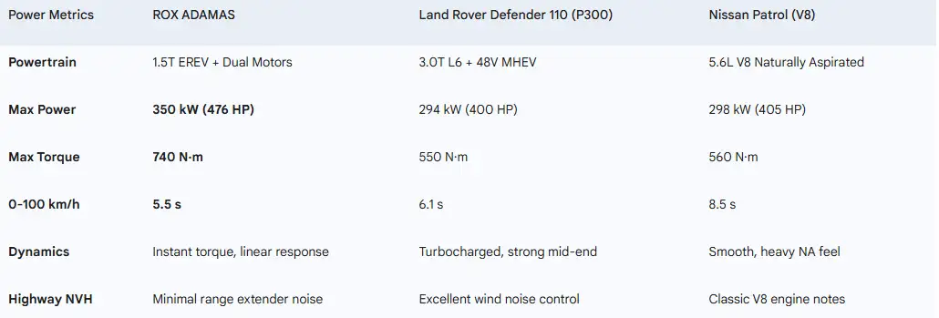 Explosive Power Test: In Sports mode with a State of Charge (SOC) above 80%, the ROX ADAMAS—boasting a maximum power of 350kW (476 HP) and instantaneous torque of 740 N·m—consistently achieved 0-100 km/h in 5.5 seconds across three consecutive runs. In comparison, the traditional Nissan PatrolUAE Nissan PatrolKSA Nissan PatrolKuwait Nissan PatrolQatar Nissan PatrolBahrain Nissan PatrolOman Nissan PatrolEgypt Nissan Patrol V8 felt noticeably more sedate.