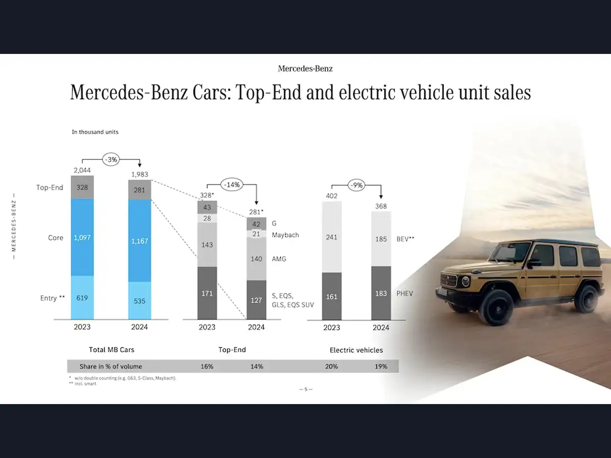 In 2024, total Mercedes-Benz vehicle sales dropped 3% year-on-year to 1,983,400 units. Sales of pure electric models fell by 23% to 185,000 units.