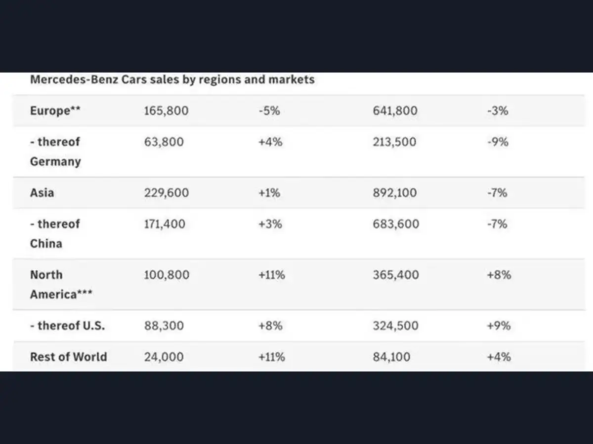 Asia: Total sales fell 7% to 892,000 units. In China, Mercedes-Benz's largest single market, sales dropped 7% to 683,600 units, returning to 2019 levels.