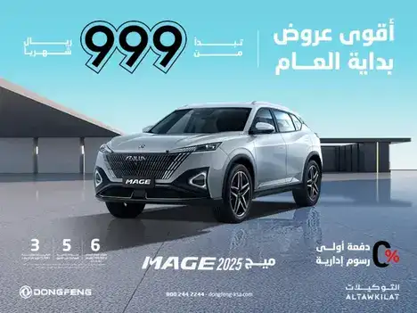 Own the new Dongfeng Mage 2025 with a monthly installment starting at 999 SAR from ALTAWKILAT, with a 0% down payment and administrative fees. Features included in this offer: 5 years of roadside assistance 3 free maintenances (20,000 Km or 1 year) 6 years factory warranty or 200,00 km (whichever comes first) Start 2025 fresh with a brand new car by clicking on Apply for Finance to fill out the application, then a representative will contact you as soon as possible to let you know of the next steps (Terms and conditions apply).Read less