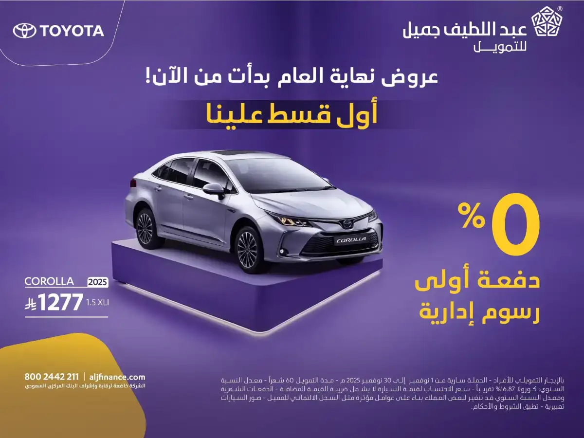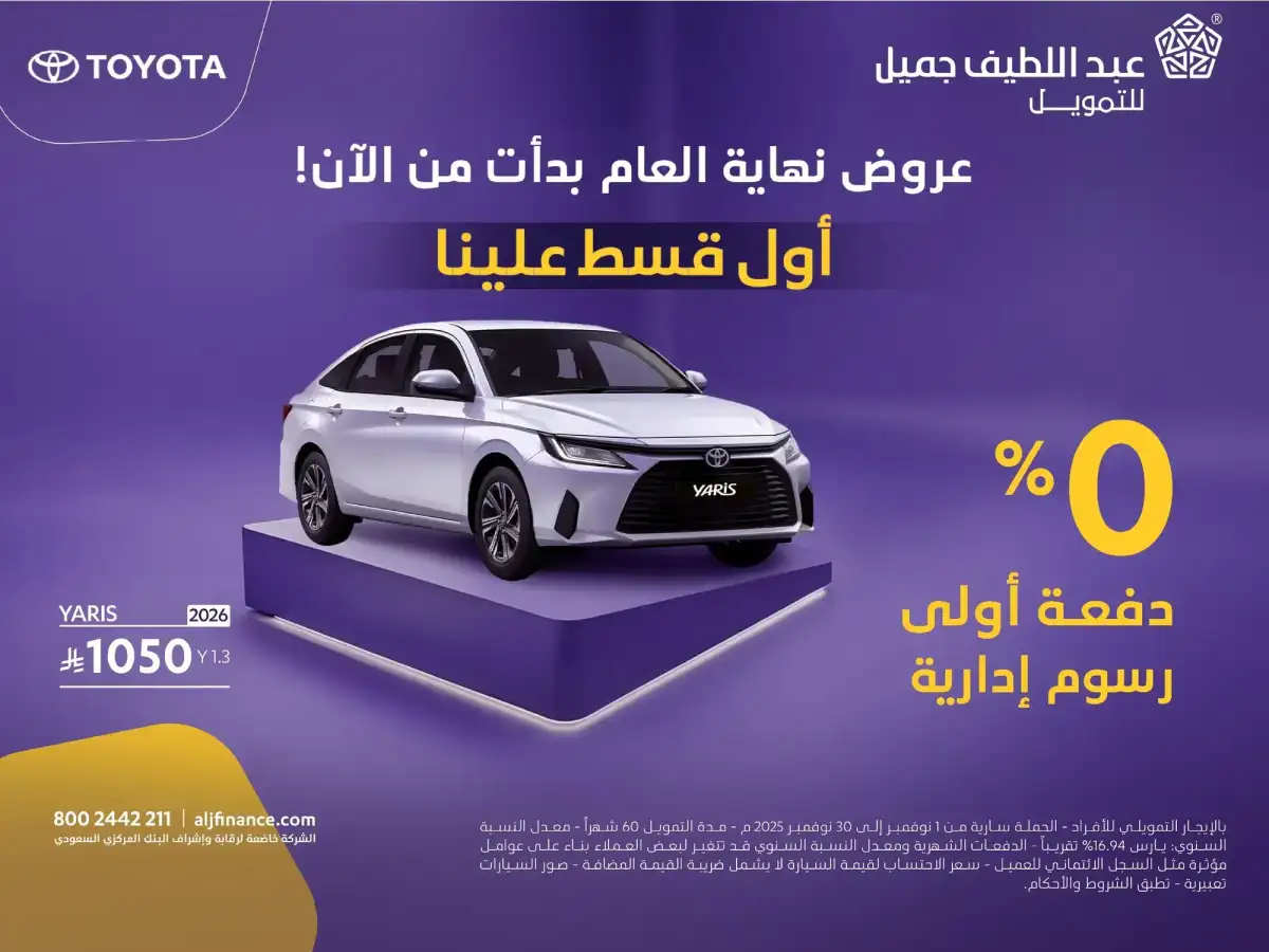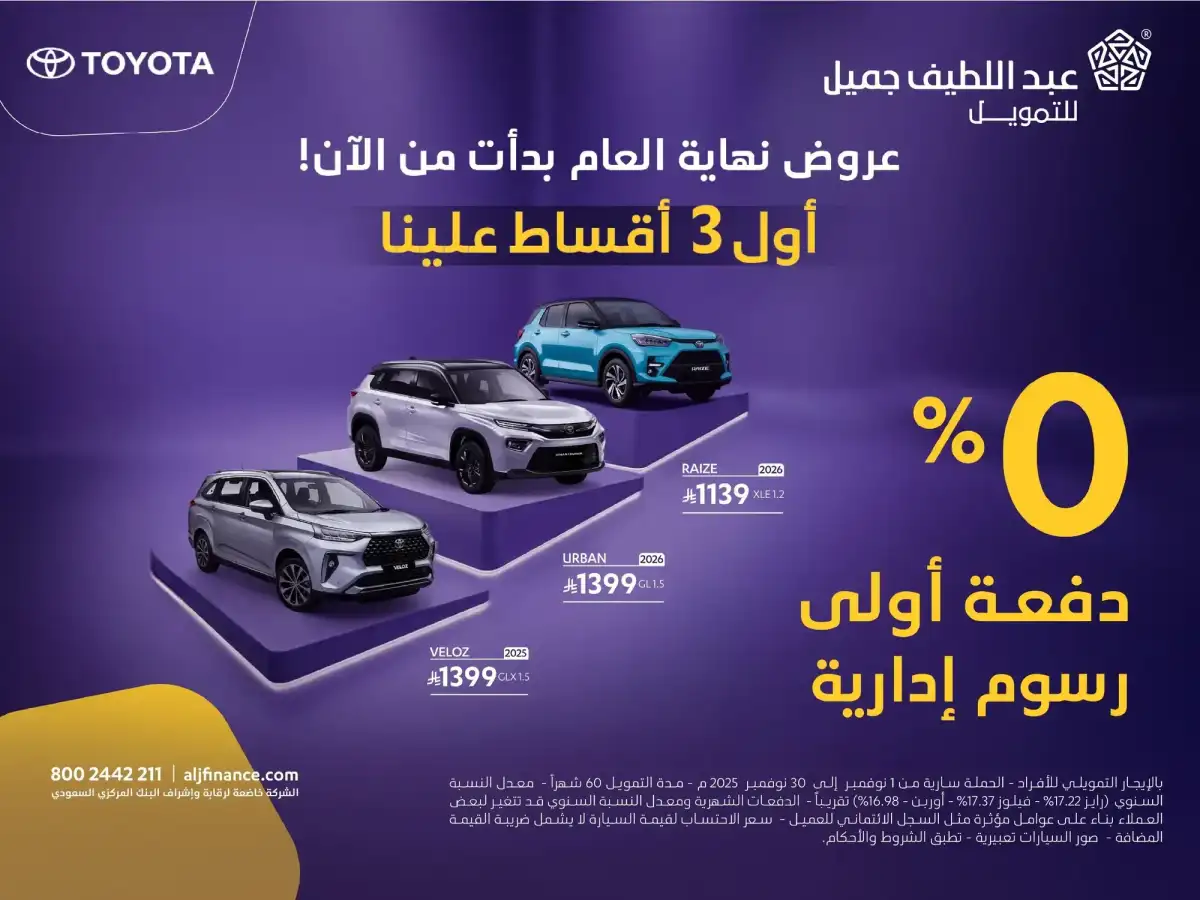 ToyotaUAE ToyotaKSA ToyotaKuwait ToyotaQatar ToyotaOman ToyotaBahrain ToyotaEgypt Toyota continues to strengthen its presence in the Saudi market with a wide range of attractive financing and after sales offers in collaboration with its exclusive distributor, Abdul Latif Jameel Motors. With the arrival of November, the brand unveils fresh campaigns that include flexible financing options, tailored maintenance programs, and end of year promotions designed to make owning a new Toyota easier than ever.