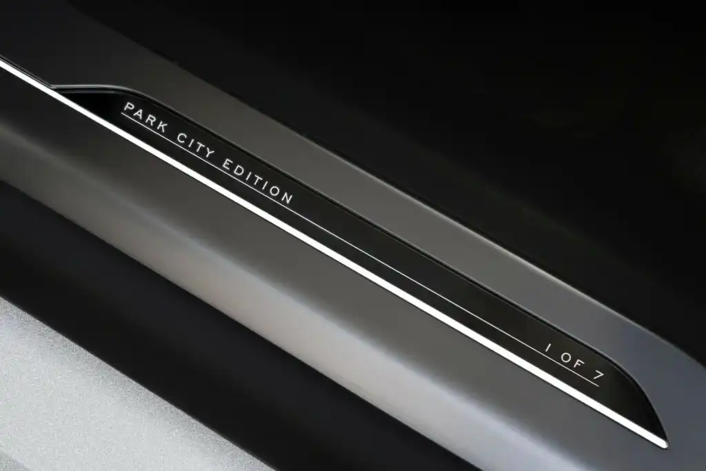 The two-tone design continues inside the elegant cabin, adorned with light cloud and ebony-colored perforated leather seats. The model also features a two-tone fabric headliner and bespoke carbon fiber trims, with special sill plates inscribed with 'Park City Edition 1 of 7' for buyers.