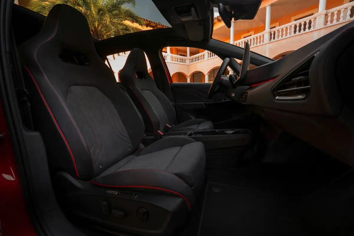 Inside, the GTX models feature supportive sports seats adorned with a mix of recycled 'Lurus' fabric and leather. The black seats receive a pop of color from red stitching and contrasting trim. Customers can also opt for ergoActive seats with electric adjustments, built-in headrests, and adjustable thigh support. The interior features wool upholstery and unique red accents.