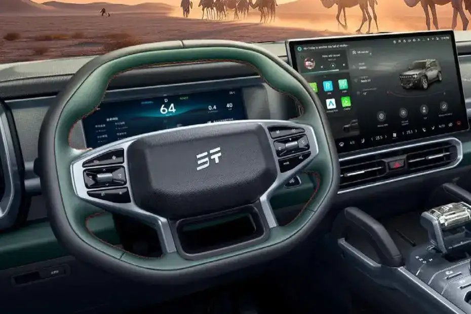 Inside, the cabin keeps things functional yet refined with clean horizontal lines and soft touch materials. Physical buttons sit alongside a wide central screen to make controls easy even on bumpy terrain. A thick steering wheel paired with a digital instrument cluster gives the driver a high, commanding view and an upright seating position reminiscent of classic expedition vehicles.