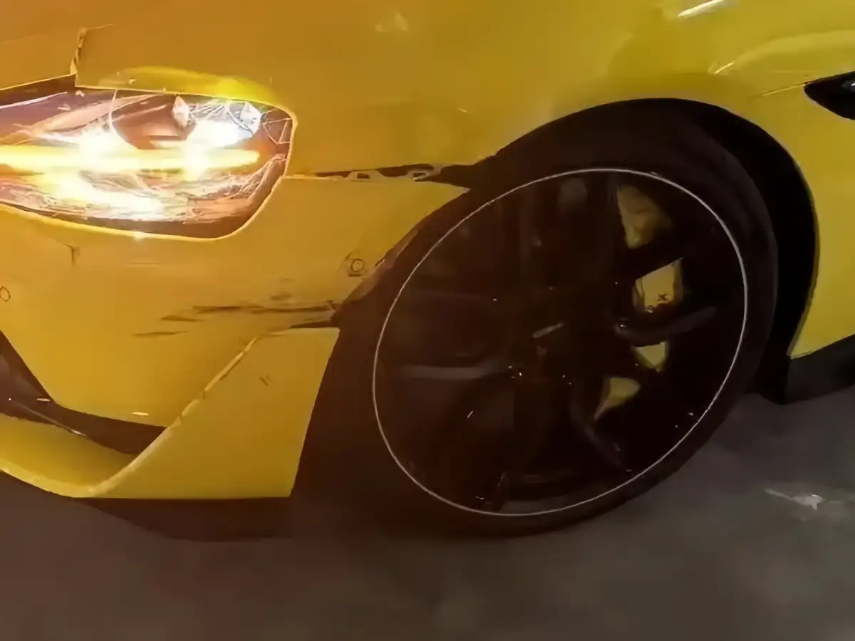 The images show a Lightning Yellow Xiaomi SU7Bahrain Xiaomi SU7Egypt Xiaomi SU7KSA Xiaomi SU7Kuwait Xiaomi SU7Oman Xiaomi SU7Qatar Xiaomi SU7UAE Xiaomi SU7 Ultra with damage to its left front fender and cracks on the headlight cover. The cause of the accident remains unclear.