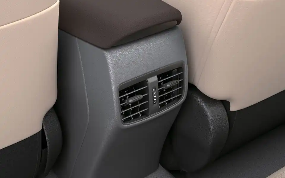 أسفل شاشة اللمس توجد منطقة تحكم بالتكييف بسيطة وسهلة الاستخدام. يقدم الداخل أيضًا عجلة قيادة متعددة الوظائف، فتحات تكييف خلفية، مقاعد قابلة للتعديل كهربائيًا، وخيار الشحن اللاسلكي، مما يزيد من الراحة والملاءمة للسائقين والركاب.