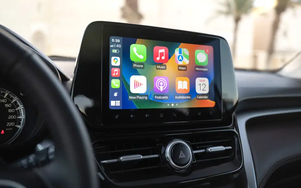 o شاشة: مزودة بشاشة تعمل باللمس مقاس 7 بوصة، تدعم نظامي Apple CarPlay وAndroid Auto، وتوفر وظائف الترفيه والملاحة الأساسية.