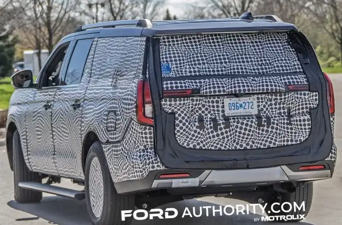 وهذا ليس مفاجئاً نظراً لأن إكسبيديشن تشترك مع F-150 في المنصة والأجزاء الميكانيكية الأخرى. ومع ذلك، بمجرد وصولنا إلى الجزء الخلفي من هذا النموذج، يمكننا أيضاً إلقاء نظرة أفضل على تصميم الباب الخلفي الجديد لطراز 2025. يشبه الباب إلى حد ما التصميم الموجود في إيفرست وكذلك فورد إكسبلورر 2025 المحدثة. توفر الصور رؤية أفضل لتصميم المصابيح الخلفية الجديد والباب الخلفي نفسه.