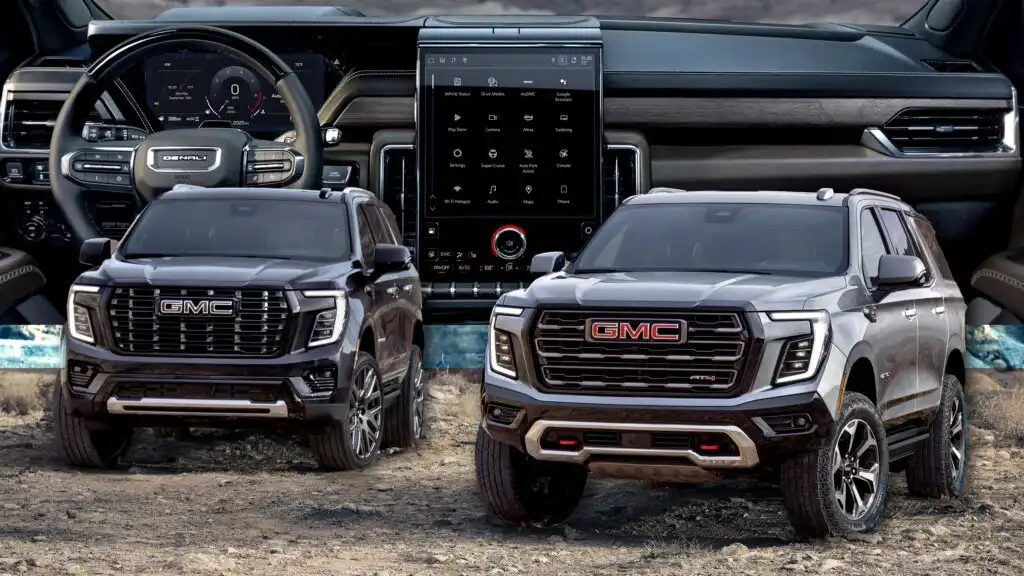وفي الداخل، تم إعادة تصميم لوحة القيادة بالكامل، بما يتماشى مع الاتجاه الحديث لتجهيز سيارات الـSUV كاملة الحجم. تأتي بشاشات ضخمة مثل الشاشة مقاس 55 بوصة في كاديلاك إسكاليد 2025. كما أن نظام المعلومات والترفيه الجديد مقاس 16.8 بوصة الموضوع رأسياً في يوكون يمثل تحديث كبير على السابق.