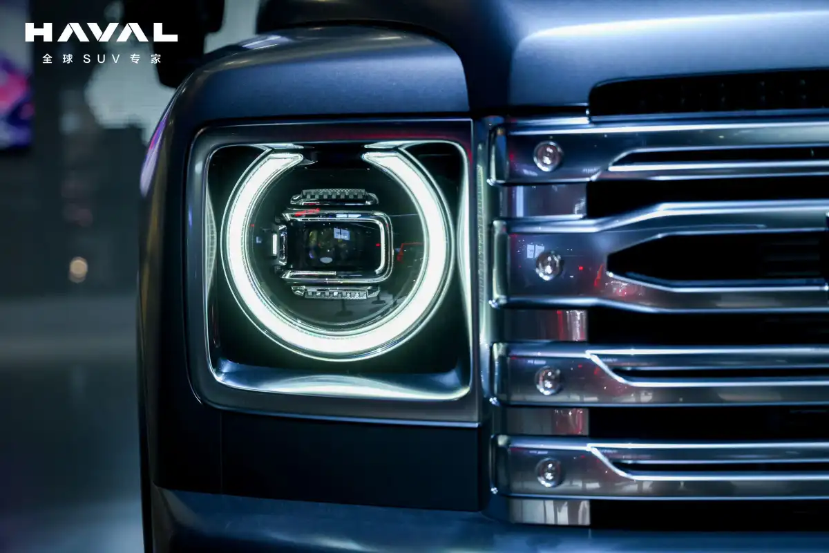 تستخدم السيارة الجديدة أسلوب تصميم “مربعي” عصري، مما يظهر تأثيرًا بصريًا قويًا وقديم. يتكون الشبك الأمامي من أربعة شرائط كروم قوية في المنتصف، مزينة بمسامير في النهايات، مع الشعار "HAVAL" مدرج في المنتصف. تم تصميم الأضواء الجانبية على شكل مربع عتيق، مع وجود مصابيح LED دائرية للنهار والتي تكون واضحة جدًا عند التشغيل. تؤكد المصدات السميكة وغطاء المحرك البارز خصائص السيارة القوية في الطرق الوعرة.