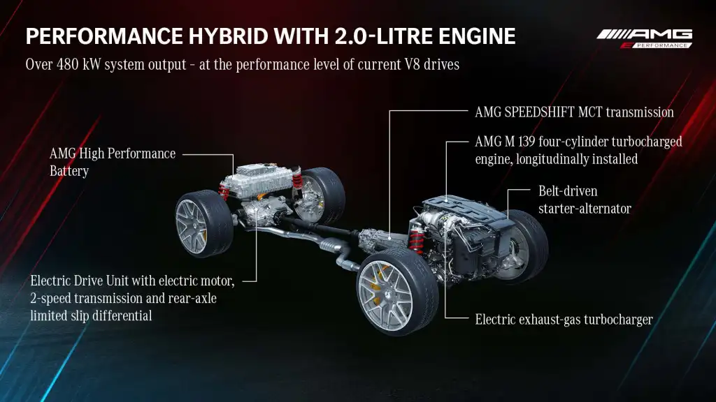 من المتوقع أن تحتوي السيارة تحت غطاء المحرك على نفس مجموعة نقل الحركة الهجينة القابلة للشحن المعتمدة على توربو 4 التي توجد في سيارة 2024 C 63 S E Performance التي تم إطلاقها مؤخرًا. يعد محرك التوربو 4 سعة 2.0 لتر إصدارًا مطورًا من المحرك الموجود في مجموعة سيارات AMG المدمجة الحالية. بفضل إضافة شاحن توربيني كهربائي، يزداد ناتج المحرك إلى 469 حصانًا. يتم توصيل المحرك بعد ذلك بمحرك كهربائي في تكوين هجين خفيف لتوفير الطاقة للميزات المساعدة، وكذلك للعمل كمحرك بدء التشغيل.