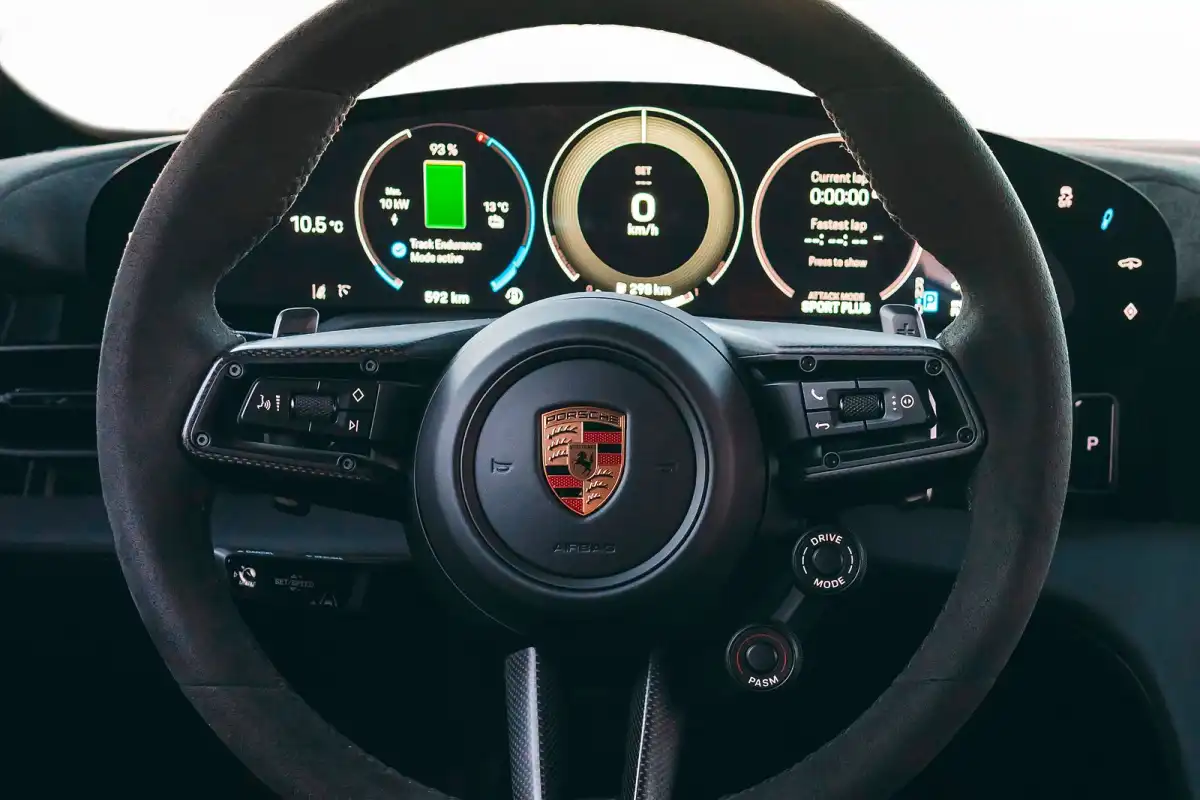 تحصل Turbo GT على نفس عجلة القيادة الموجودة في موديلات Porsche GT الأخرى المغلفة باللون الأسود Race-Tex مع علامة الساعة 12 في الأعلى. على عكس GT3، يتحكم ناقل الحركة الأيسر في الكبح المتجدد بينما يقوم الأيمن بتنشيط “وضع الهجوم”، الذي يضع السيارة في أقصى قدر من العدوان لمدة 10 ثوانٍ. قامت بورشه أيضًا بتضمين وضع التحمل على المسار الذي يمكنه تبريد البطاريات لجلسات المسار الممتدة.