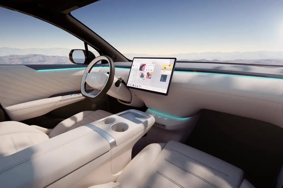 وتتميز السيارة من الداخلية بتصميم فاتح اللون، وشاشة وسائط متعددة كبيرة في الكونسول الوسطي، بالإضافة إلى نظام HUD. وشاشة قابلة للطي مخفية فوق رأس الراكب، يمكن إيقاظها لفتحها أو تخزينها بواسطة مساعد صوتي.