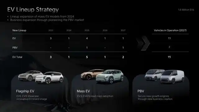 تقوم كيا حاليًا بتحضيرات نشطة لطرح 15 سيارة كهربائية جديدة، بما في ذلك طرازات مثل EV2 وEV4 وEV3، بهدف إكمال هذا المشروع بحلول عام 2027، مع السعي لتحقيق مبيعات سنوية تصل إلى 1.6 مليون وحدة بحلول عام 2030. بالإضافة إلى السيارات الكهربائية، ستقوم كيا بتوسيع مجموعة سياراتها الهجينة من 6 طرازات في عام 2024 إلى 9 طرازات بحلول عام 2028، بهدف تحقيق 20% من المبيعات العالمية.