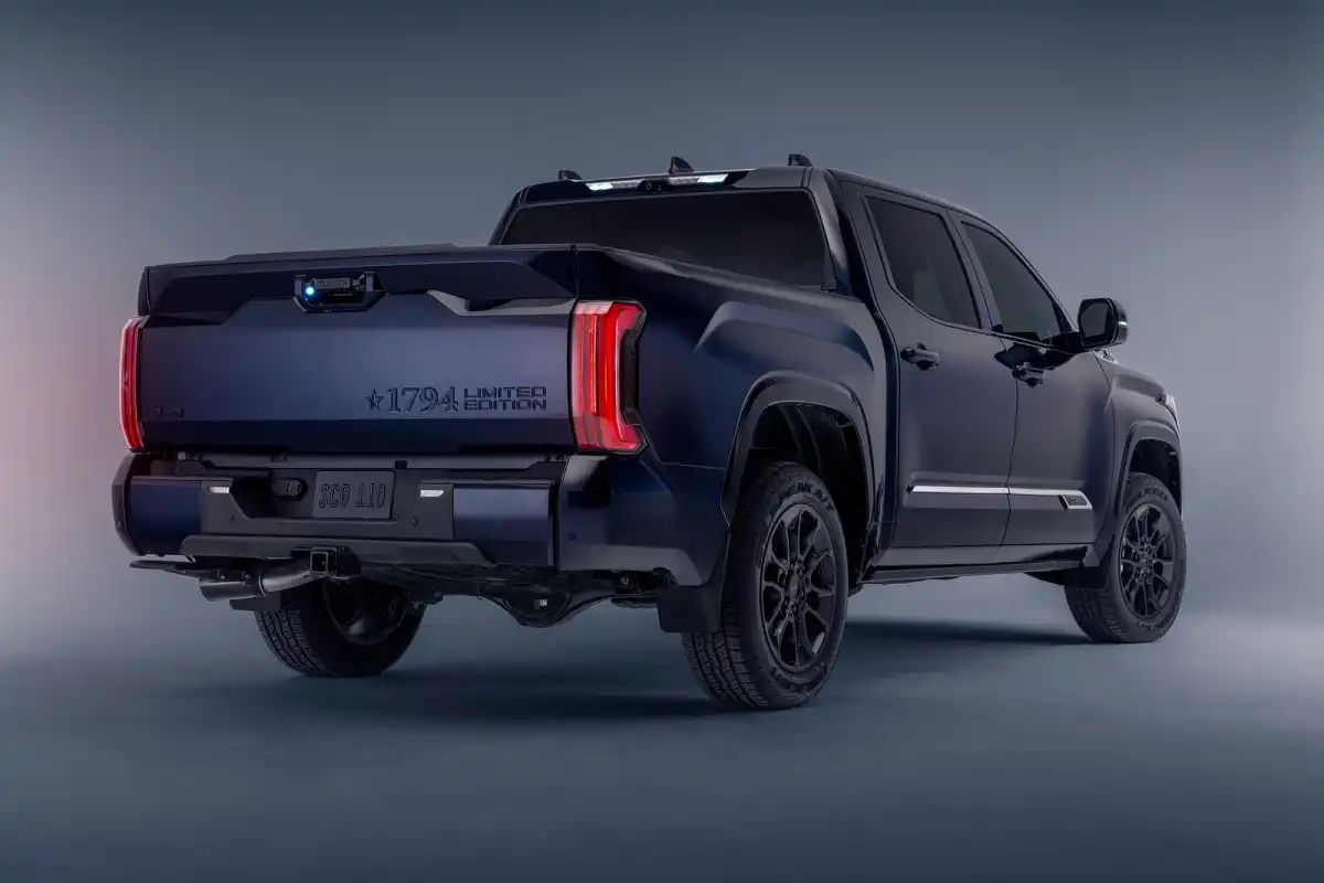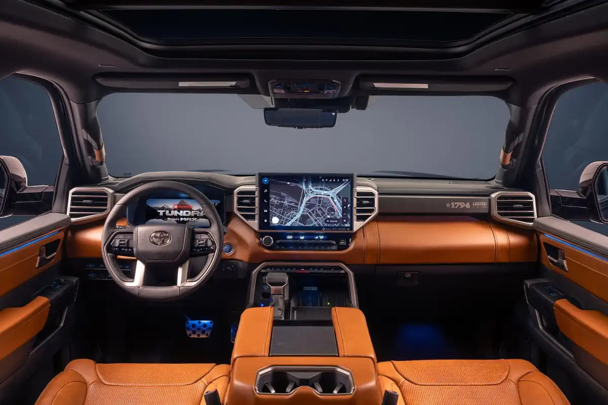 كشفت تويوتا عن إصدار محدود آخر من تندرا 1794 في تكساس، مصمم لجذب عشاق الشاحنات وجامعيها، مع إنتاج 1500 وحدة فقط. اسم تندرا 1794 مستمد من المزرعة التي يقع فيها مصنع تويوتا في سان أنطونيو، مما يوفر تكريمًا مناسبًا لجذورها. تتميز هذه النسخة المحدودة بتصميم داخلي جلدي فاخر. تعاونت تويوتا مع شركة Saddleback Leather الشهيرة لتقديم تصميم داخلي مخصص، بما في ذلك جيوب خلفية فريدة ومقبض مميز لمسند ذراع المقعد الخلفي.