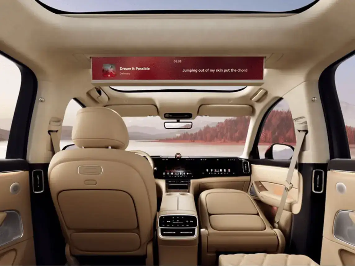 وتحاكي المقصورة بيئة ترفيهية متكاملة، حيث تضم شاشة عرض قابلة للطي بقياس 32 بوصة يمكن التحكم بها عن بُعد، ونظام صوتي متقدم بتوقيع Huawei Sound يتألف من 19 وحدة صوتية توفر صوتًا غنيًا ومحيطيًا في جميع أرجاء السيارة. كما زُوّدت المقصورة بثلاجة مدمجة تعمل بتقنية الضغط، تدعم التبريد حتى 0 درجة والتسخين حتى 50 درجة، ما يضمن راحة إضافية للركاب في مختلف الأجواء والمناسبات.