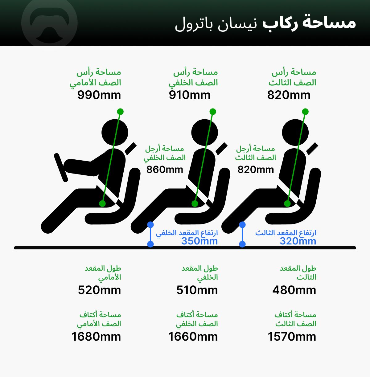ورغم ذلك، وبسبب تصميم المقاعد المتدرج في باترول، نجد أن مستوى جلوس الصف الثاني أعلى من الأول، والصف الثالث أعلى من الثاني، ما يؤدي إلى تقلص تدريجي في المساحة الرأسية كلما اتجهنا للخلف. غير أن هذه الهندسة تمنح ركاب الصفين الثاني والثالث رؤية واضحة ومفتوحة للأمام، فتقلّ لديهم الإحساس بالضيق أو الانغلاق.