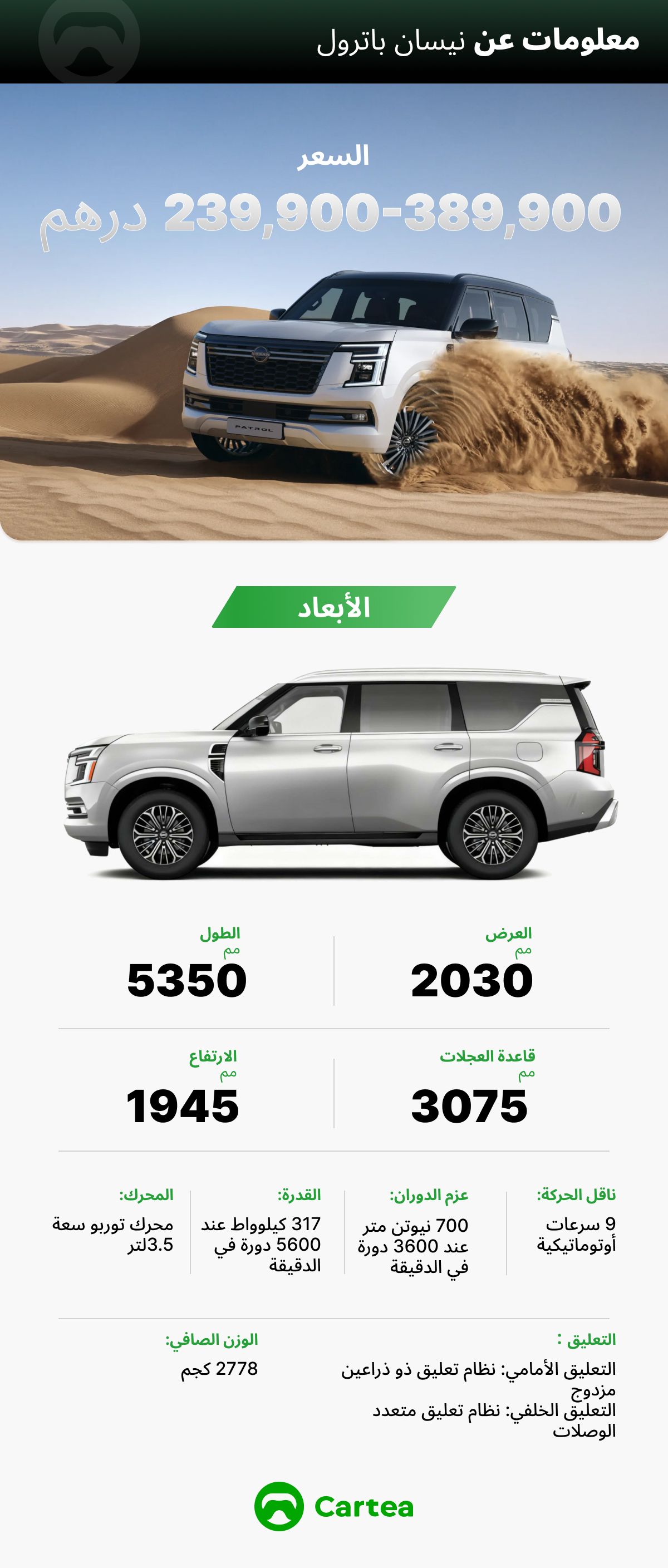 تعتبر نيسان باترول سيارة متكاملة تلبي متطلبات المستخدمين في الشرق الأوسط، مع سعة داخلية كبيرة وقدرات عالية على الطرق الوعرة، ما يجعلها مثالية للعائلات ومحبي المغامرات في الصحراء. وإذا وقع الاختيار على الفئة الأساسية التي يبدأ سعرها من أكثر من 200 ألف درهم إماراتي، فستكون أقل قوة من الفئات الأعلى وتفتقر لبعض وسائل الراحة، لكنها تحتفظ بقدراتها على الطرق الوعرة ومساحتها الرحبة. ويتميز الصدام الأمامي للفئة الأساسية بزوايا اقتراب أفضل، ما يجعلها ملائمة أكثر لعشاق التعديل واستخدام السيارة في المغامرات الصحراوية.