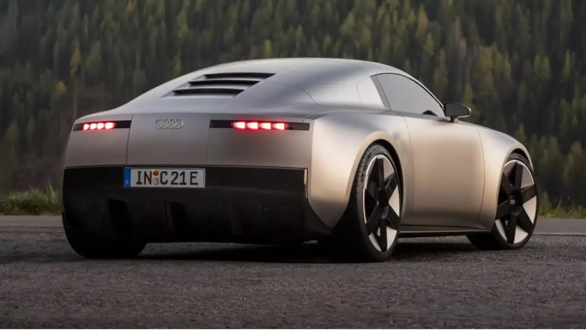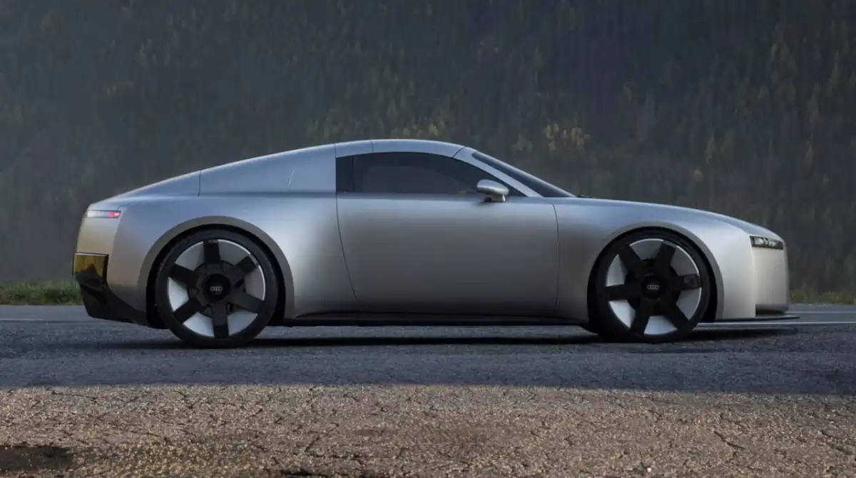 الهيكل يأتي بلون “التيتانيوم” المعدني الذي يعكس مزيجاً من الأناقة والقوة. على الجوانب، تنساب الخطوط بسلاسة بشكل عضلي دون مبالغة، مع أقواس عجلات مستوحاة من سيارات أودي الكلاسيكية R8 وTT، بينما يذكرنا مؤخرة السيارة بلوحات السيارات التاريخية ذات الزعانف المستوحاة من سيارات السباق القديمة، إذ استُبدل الزجاج الخلفي بشفرات تهوية تضيف لمسة سباقية عريقة.