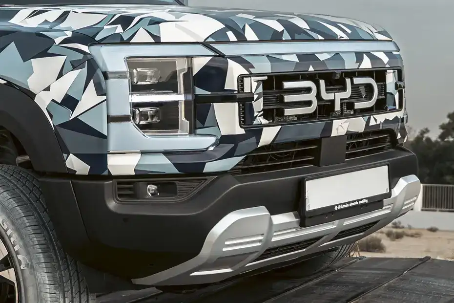 استوحت بي واي دي تصميم شاحنتها من القرش الذي يحمل الاسم نفسه، حيث جمعت بين الطابع القوي واللمسات العصرية. المقدمة تحتضن مصابيح LED رأسية تذكر بمظهر فورد F-150، مع شبك أمامي عريض وشعار بارز يتوسطه، بينما يضيف لوح الحماية السفلي لمسة من الصلابة.