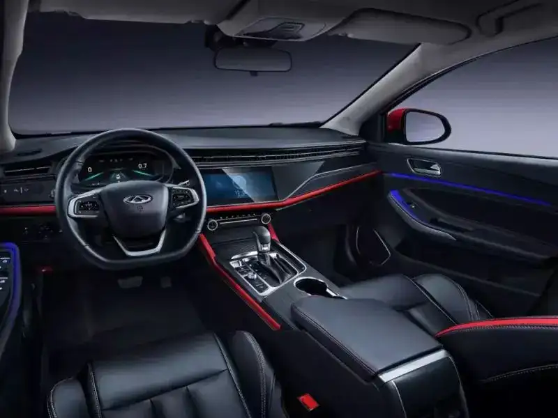 من الجانبين، تظهر الخطوط الانسيابية التي تمتد من المقدمة حتى الخلف، مع لمسات حمراء تزين بعض العناصر، إلى جانب جنوط ألمنيوم قياس 17 بوصة. أما في الخلف، فقد زودت السيارة بمصابيح خلفية متصلة بشريط كرومي ومصد خلفي بارز يحتوي على عواكس وكاميرا خلفية ومخرجين للعادم.