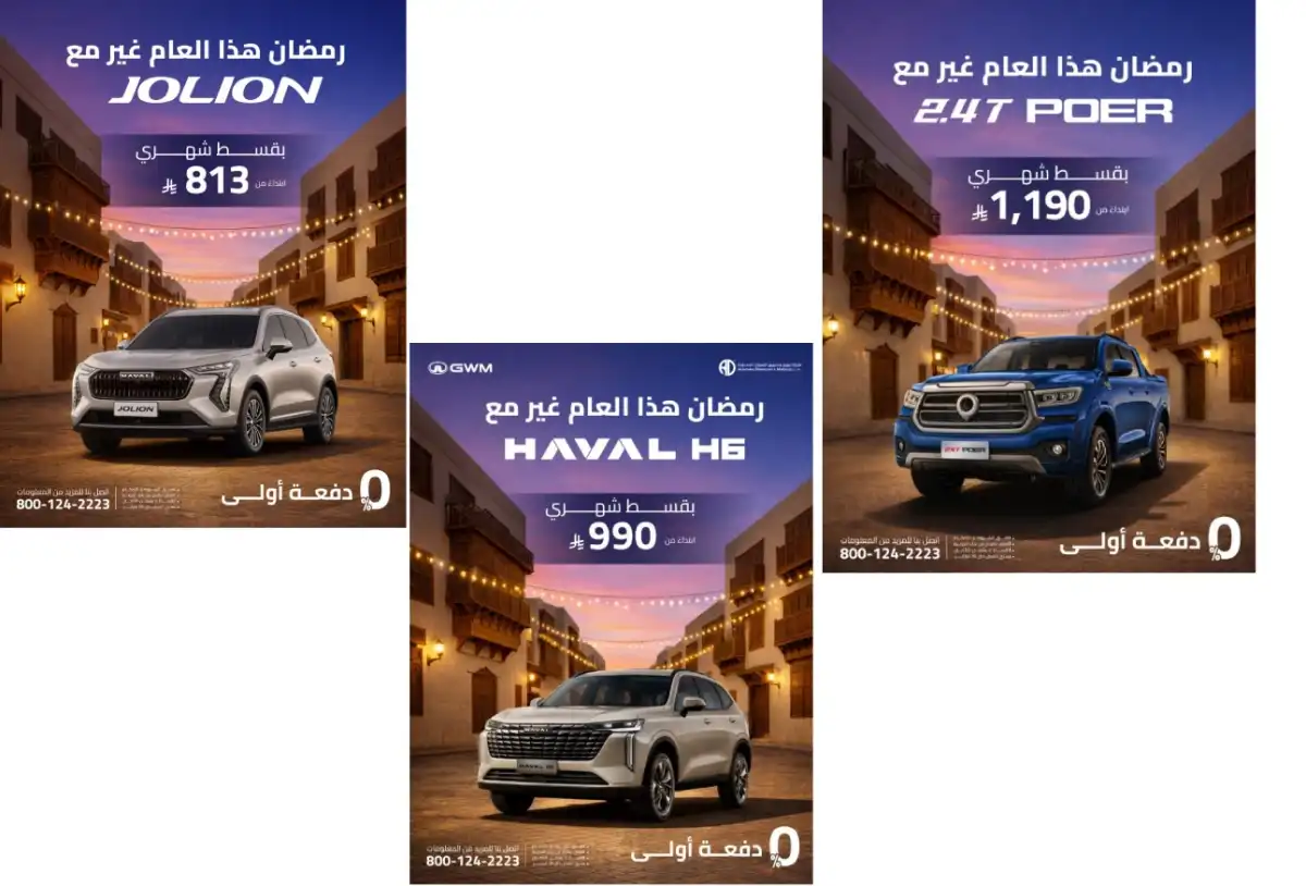 عروض رمضان 2026 من توزيع وتسويق السيارات إعصار ذهبي: هافال H6 بـ990 ريال/شهر، جوليان 813 ريال، جريت وول بوير 1190 ريال بدون مقدم حتى 28 فبراير. مع ضمان 7 سنوات، أمان 5 نجوم، وتقنية تفوق اليابانيين، تصبح السيارات الصينية بوابة ملكية سهلة للعائلات السعودية في رمضان المبارك. لا تفوتي - السحب الصيني يغزو الخليج!