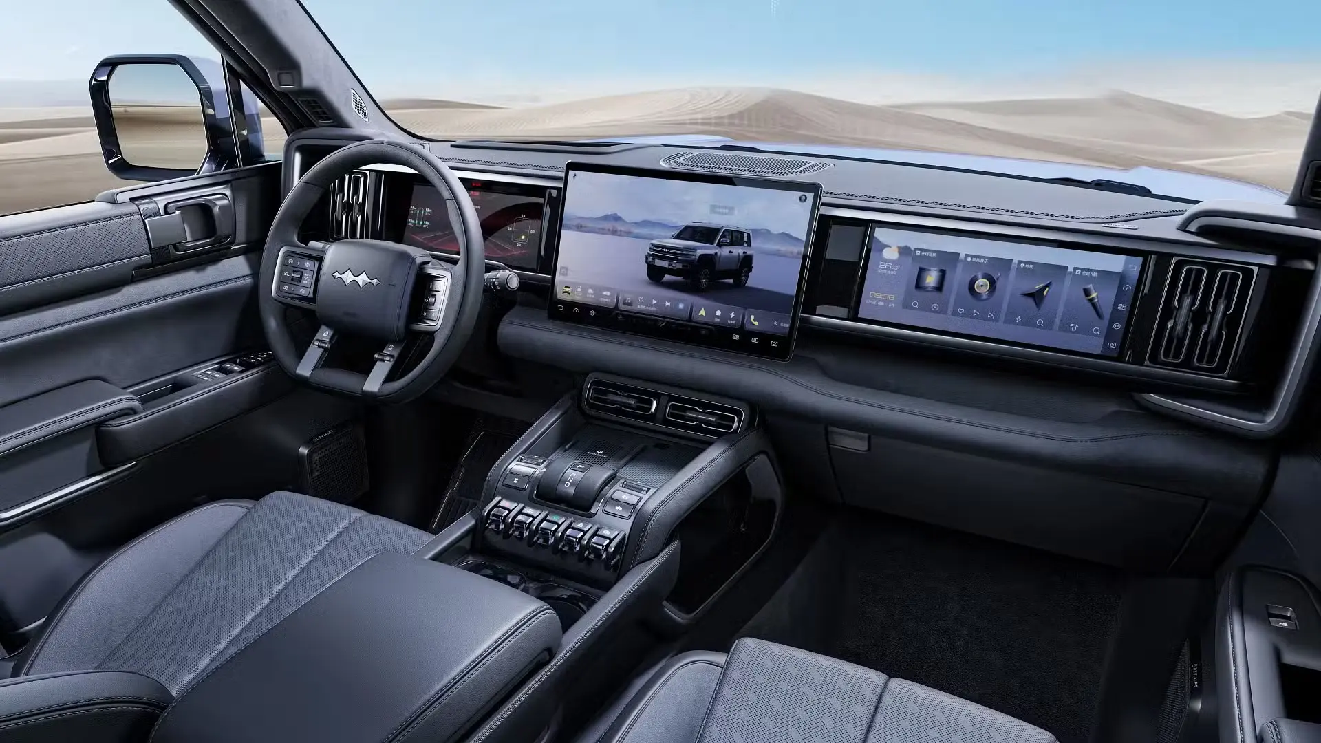 أما المقصورة الداخلية فتمنح ركابها إحساس الصالات الاسكندنافية الهادئة، مع فرش جلدي فاخر وسقف بانورامي واسع، بالإضافة إلى مقاعد أمامية قابلة للتدفئة والتهوية. تقدم دينزا حلولاً ذكية للتخزين ولمسات عملية مثل ثلاجة مدمجة وعجلة قيادة مدفأة، لتوفر راحة استثنائية تناسب أجواء الإمارات والخليج.