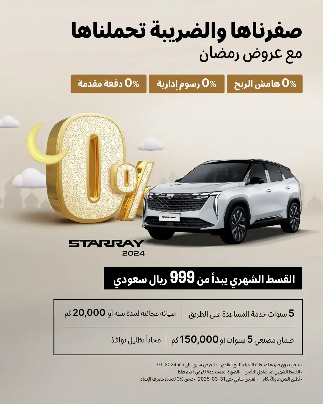 جيلي ستار راي 2024 فئة GL بقسط شهري يبدأ من 999 ريال سعودي