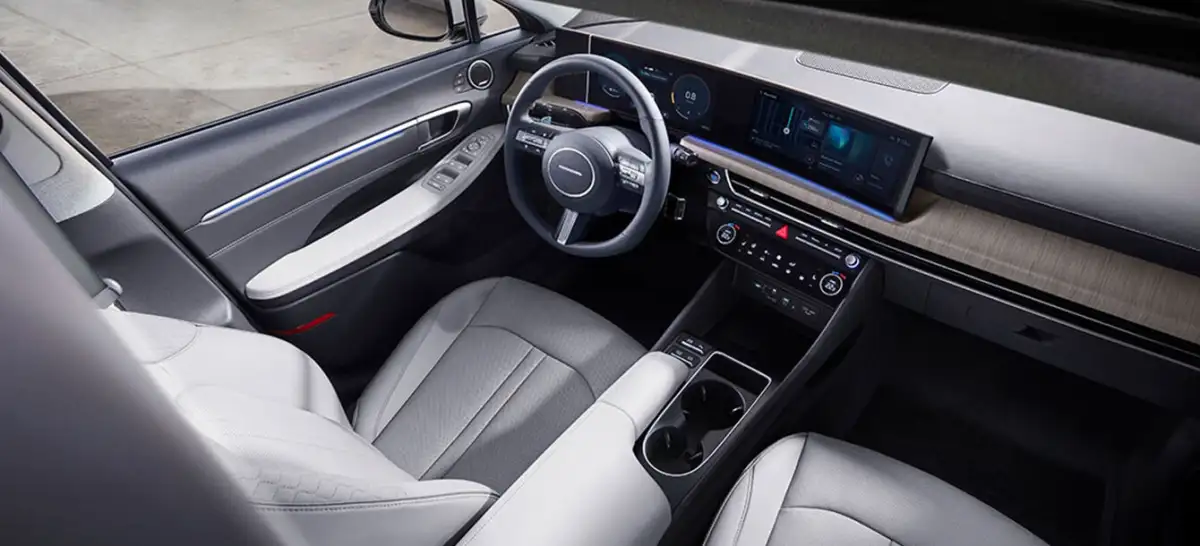 أما المقصورة الداخلية لسيارة سوناتا فهي مستوحاة من التكنولوجيا، مع شاشة مركزية قياسية قياس 10.25 بوصة (مع دعم Apple CarPlay وAndroid Auto) مرتبطة بلوحة عدادات كاملة بشاشة LCD قياس 12.3 بوصة لتصميم متكامل. أما المقاعد فهي مكسوة بالجلد الفاخر وتوفر تهوية في الأمام، كما تمت إضافة نظام صوت Bose إلى الطرازات الأعلى. ويغلب على الجو العام طابع الشباب والأناقة.
