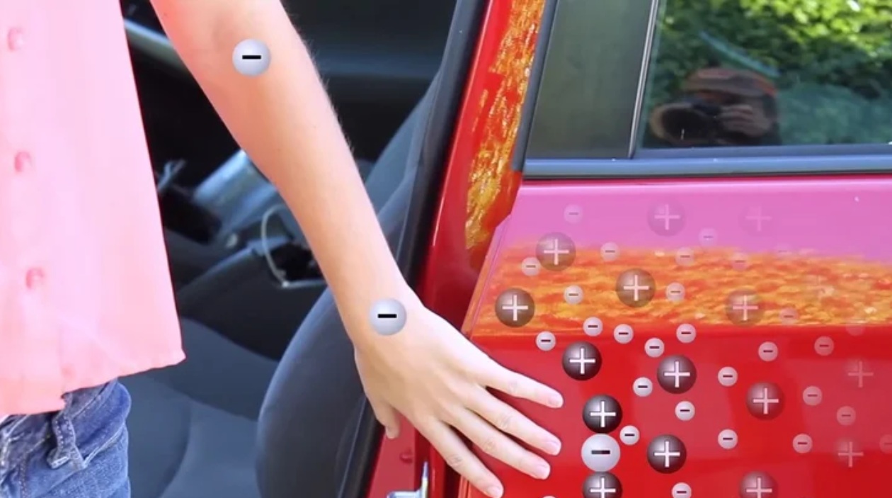 الاحتكاك بين سطحين (ملابسك ومقعد السيارة مثلاً) يؤدي إلى انتقال إلكترونات من أحدهما للآخر، فيبقى أحد السطحين مشحوناً بشحنة زائدة ينتظر “تفريغها” عند ملامسة جسم مؤرض.