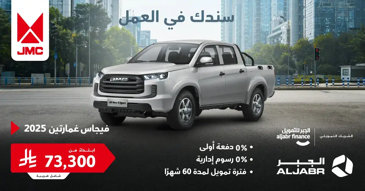 أعلنت شركة الجبر للسيارات، الوكيل الحصري لعلامة JMC في المملكة العربية السعودية، عن تقديم عروض تمويل استثنائية على اثنين من أبرز طرازاتها في فئة الشاحنات الخفيفة: JMC فيجاس غمارتين 2025 وJMC جراند أفينيو 2025. ويأتي هذا الطرح ضمن استراتيجية الشركة لتلبية احتياجات رواد الأعمال والمستخدمين التجاريين الباحثين عن حلول نقل عملية واقتصادية.