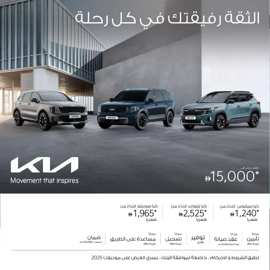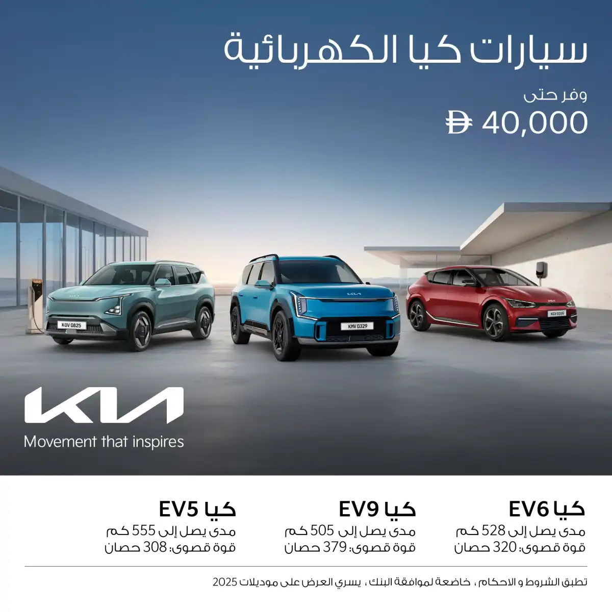 التيار Motors تُشعل دبي بـعروض كيا 2026: Sportage 1.6T من 88,000 درهم (توفير 40K)، EV6 0% تمويل 60 شهر (158K درهم)، Seltos 1.5L 80,850 درهم، K4 92K، Carnival 8 مقاعد 119K، Tasman Pickup 120K 4x4، عروض يناير تنتهي 31/1، 18 وكيل UAE (دبي/أبوظبي/الشارقة)، EV3 155K كهربائي، K8 149K فخامة، تمويل Mashreq/Rajhi، ضمان 7 سنوات، مثالي نخلة جميرا/الشيخ زايد.