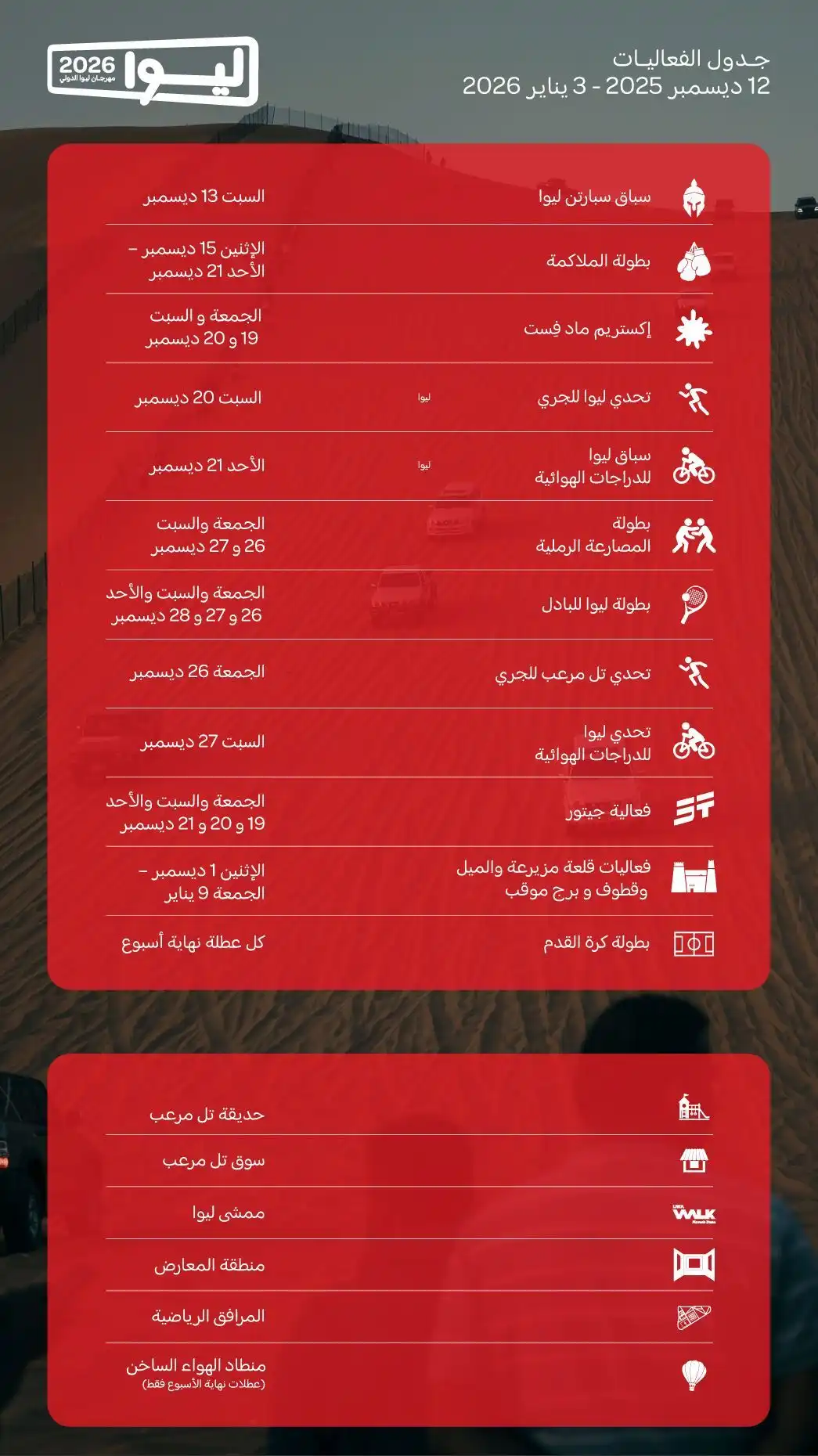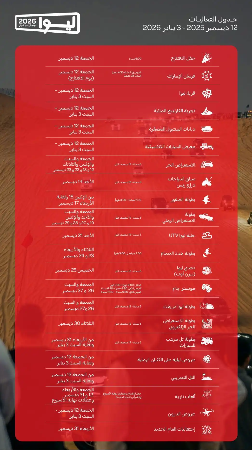 مرحبا بكم في حفظ الأحداث الزمني 2026 مهرجان ليوا الدولي. يرجى الاحتفاظ بها آمنة والتمتع رحلتك!