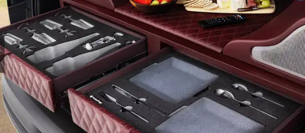 بالإضافة إلى ذلك، أضافت إنفينيتي أدراج لتخزين العناصر الصغيرة، مع تغليف كل شيء بجلد بورجوندي يتناسب مع المقاعد. يتميز الجزء الخارجي بطلاء رمادي غير لامع وعجلات مقاس 24 بوصة مستوحاة من طراز QX مونوجراف، مما يعكس تصميم الجيل الحالي من QX80. كما تم تخفيض ارتفاع نظام التعليق.