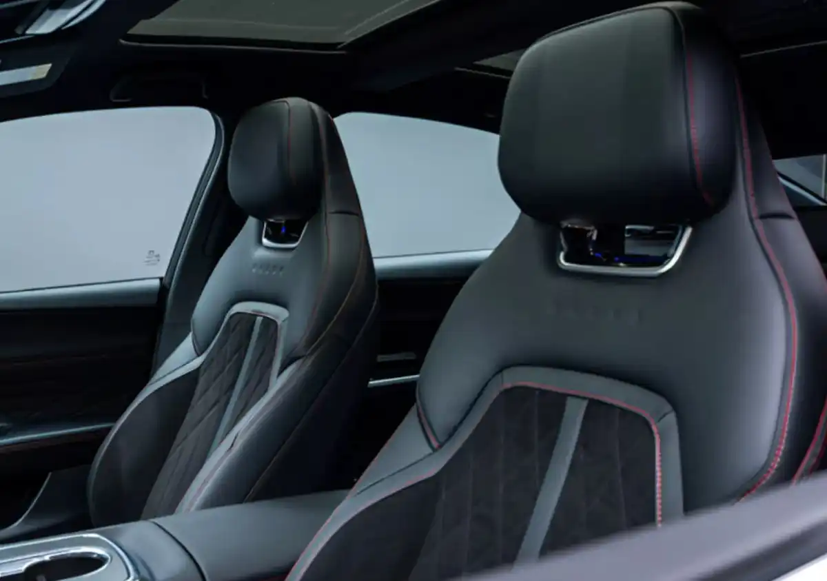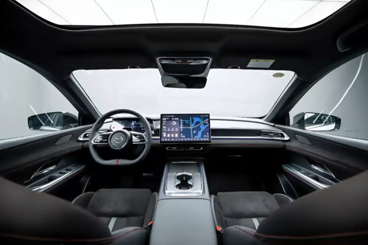 يكشف الدخول إلى مقصورة EZ-6 سبورت عن مستوى عالٍ من العناية بالتفاصيل، حيث تأتي المقاعد مغطاة بقماش ألكانتارا الفاخر، مع تطريزات بارزة باللون الأحمر تزين المقاعد وعجلة القيادة، ما يعزز الشعور الرياضي ويمنح المقصورة مظهرًا أنيقًا ومتناسقًا. وتضفي الإضاءة الخلفية الحمراء جوًا مميزًا داخل السيارة، خاصة أثناء القيادة الليلية، بينما تعكس وحدة التحكم الوسطية بزخرفتها الشبكية الطابع الديناميكي المستوحى من طرازات CX-60 الرياضية.