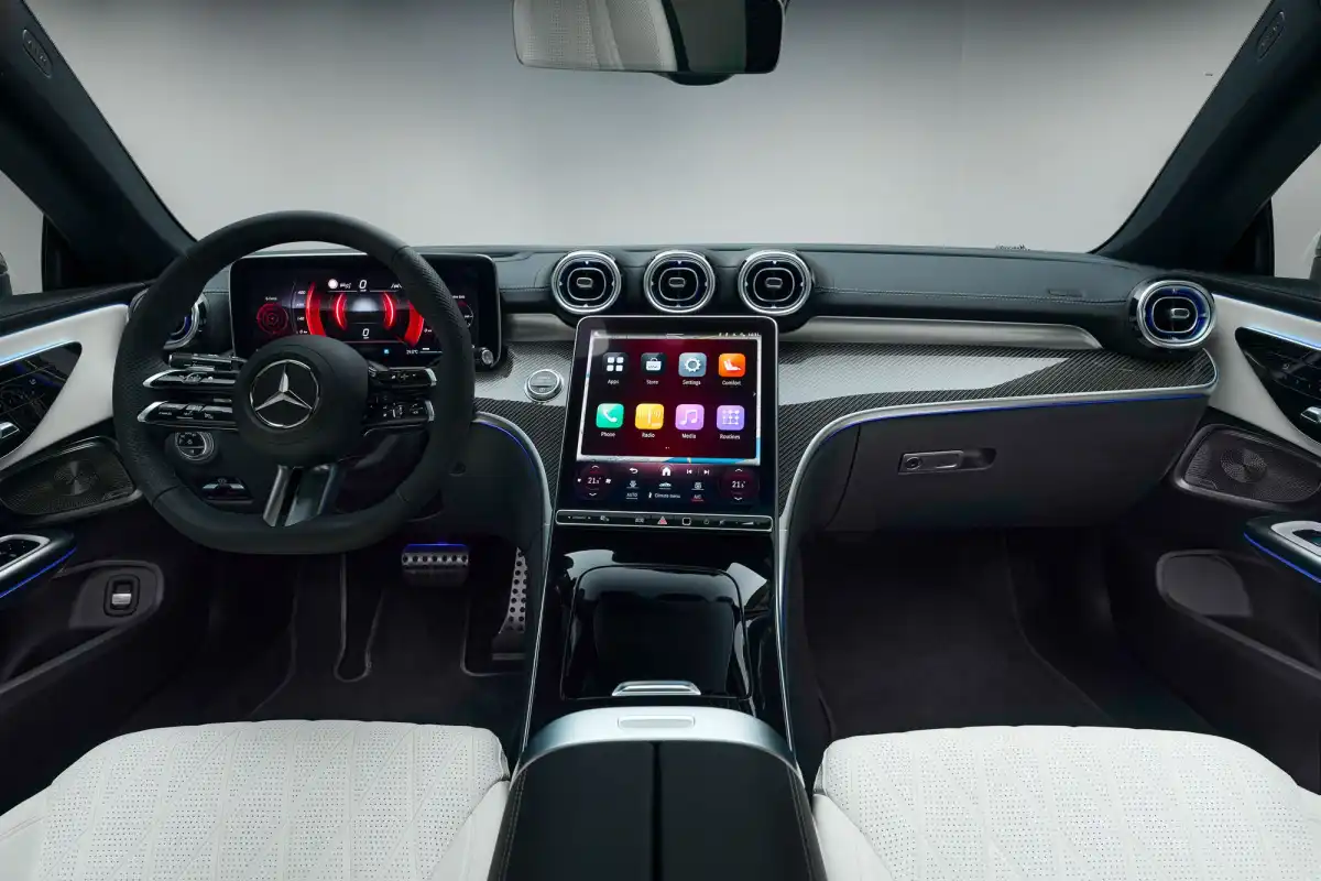 تصميم الداخلية لسلسلة CLE-Class هو نفسه في أحدث طراز C-Class، مع شاشة عرض عائمة بحجم 12.3 بوصة لمجموعة العدادات وشاشة عرض عائمة بحجم 11.9 بوصة بتوجه عمودي لنظام المعلومات والترفيه.