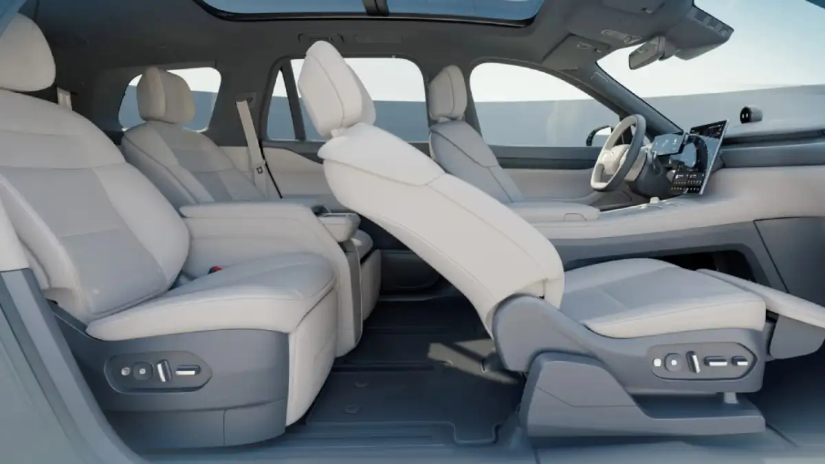 المقصورة الداخلية تحاكي صالون فخم متحرك: مقاعد جلدية مريحة، مساحة رحبة لخمسة ركاب، وتصميم داخلي أنيق يركز على البساطة والعملية. شاشة ترفيه ضخمة تسيطر على لوحة القيادة، مع نظام إضاءة محيطية ومواد عالية الجودة في كل التفاصيل. أنظمة العزل الصوتي والتكييف الذكي تضمن تجربة سفر هادئة ومريحة حتى في أصعب الظروف.