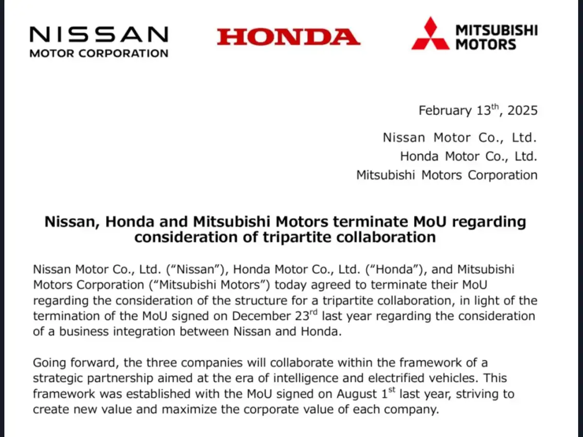بالإضافة إلى ذلك، تم إلغاء مذكرة تفاهم (MOU) كان من المقرر توقيعها في 23 ديسمبر بين هوندا ونيسان وميتسوبيشي، والتي كانت تهدف إلى بحث إمكانية انضمام ميتسوبيشي إلى الاندماج بين هوندا ونيسان. ومع ذلك، تظل الشركات الثلاث ملتزمة بالتعاون في مجالات مثل الكهربة والتقنيات الجديدة للطاقة.