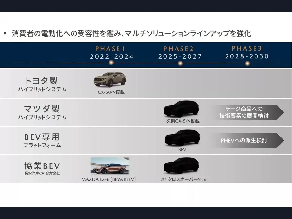 تشمل خارطة طريق الشركة الانتقال التدريجي نحو الكهرباء، بدءًا من السيارات الهجينة الخفيفة (MHEV)، والهجينة التقليدية (HEV)، والهجينة القابلة للشحن الكهربائي (PHEV). وفي الفترة بين عامي 2025 و2027، خلال المرحلة الثانية، تخطط مازدا لتسريع عملية التحول الكهربائي، بما في ذلك إطلاق منصة مخصصة للسيارات الكهربائية، بالإضافة إلى تقديم الجيل الجديد من CX-5، الذي سيعتمد على نظام دفع يجمع بين البنزين والكهرباء.
