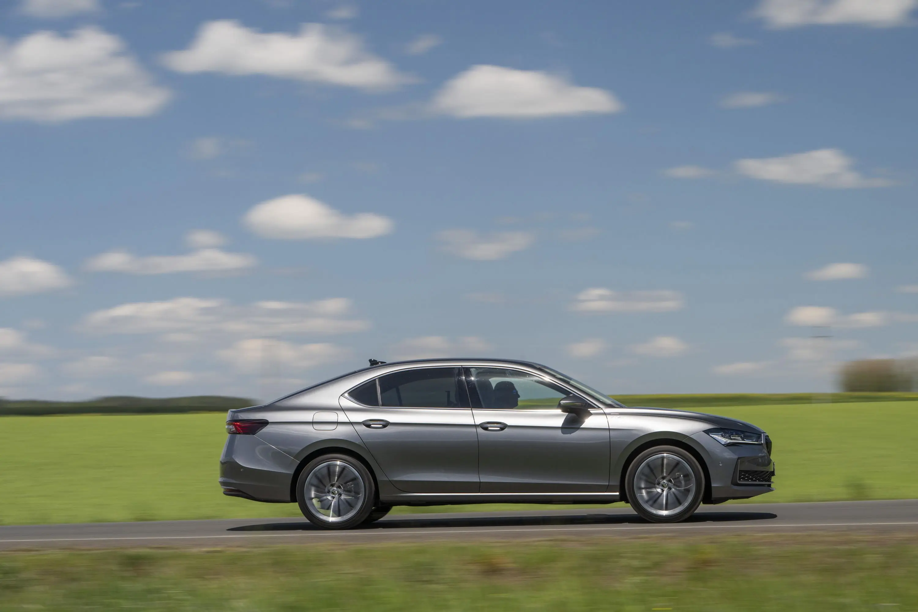 تمنح الخطوط الجانبية المرسومة بعناية إحساساً بطول إضافي، ما يعكس رحابة المقصورة حتى من الخارج، لتبدو سوبرب ملائمة للظهور أمام فندق فاخر أو في مواقف العمل في منطقة مثل مركز دبي المالي العالمي.
