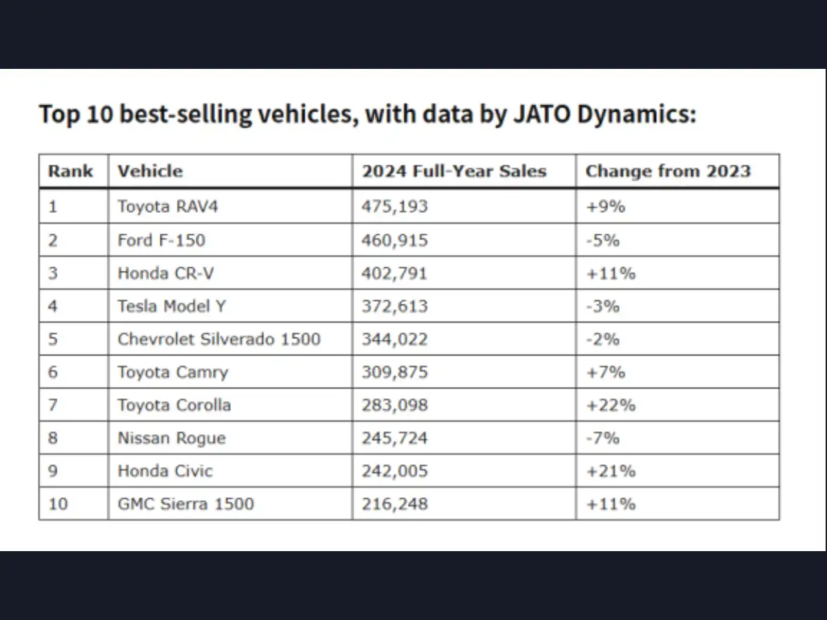 لكن وفقًا لبيانات شركة التحليل JATO Dynamics، لم تعد F-150 السيارة الأكثر مبيعًا في الولايات المتحدة لعام 2024، حيث تمكنت تويوتا RAV4 من انتزاع الصدارة، في مفاجأة غير متوقعة.