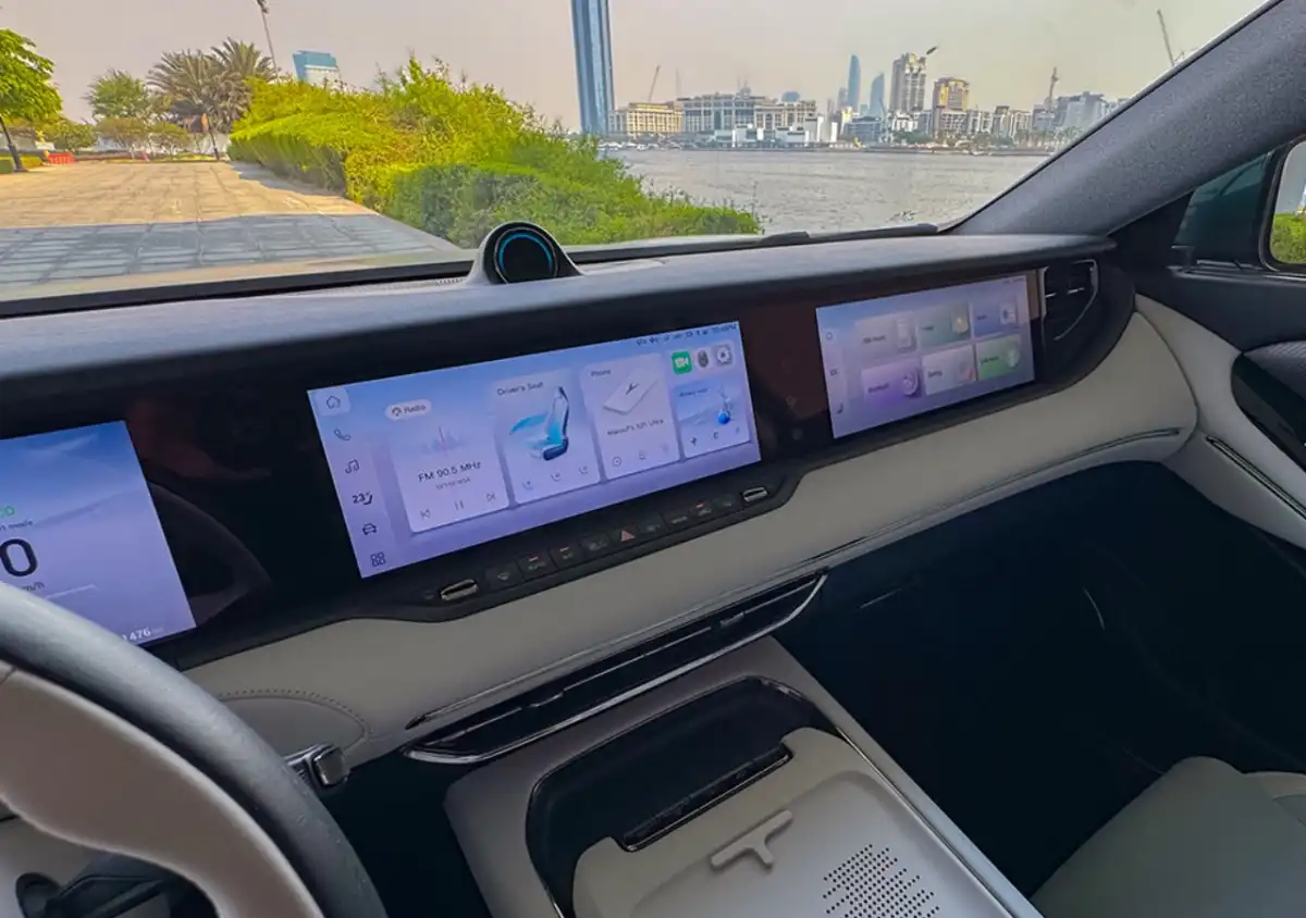 ثلاث شاشات 12.3 بوصة: لوحة عدادات رقمية، شاشة وسطية للتحكم في النظام المعلوماتي والترفيهي، وشاشة تحكم خلفية.