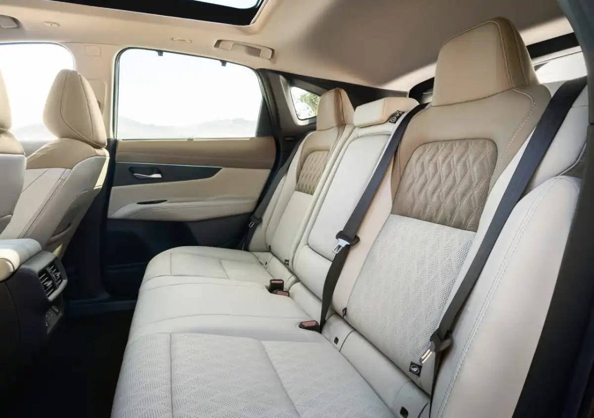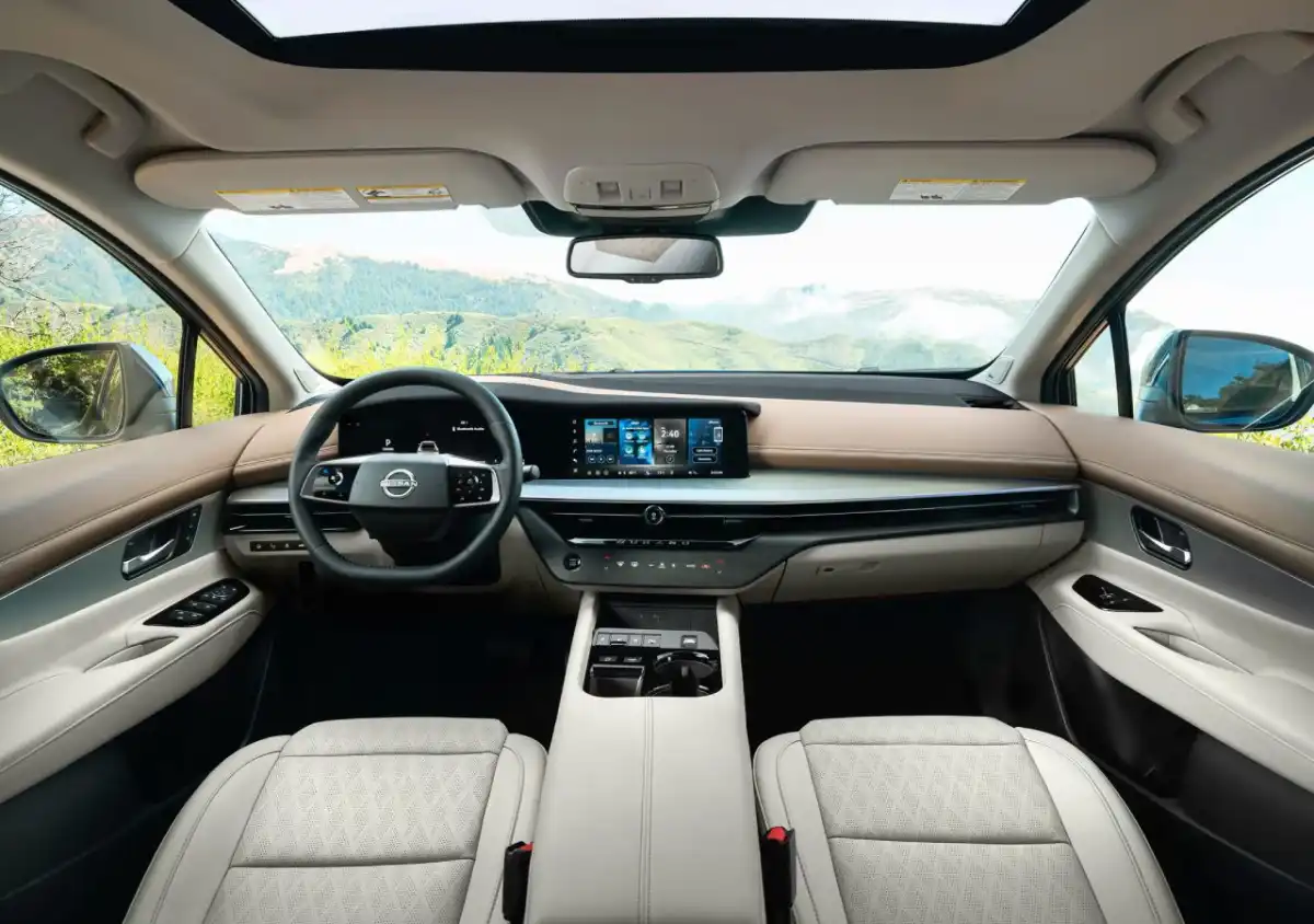 المقصورة مستوحاة من شقيقتها الكهربائية Ariya: خطوط LED، أثاث فاخر مع لمسات خشبية، لوحة عدادات رقمية وتصميم جريء. المقاعد "Zero Gravity" الأمامية والخلفية تمنح راحة غير مسبوقة في الرحلات الطويلة، مع سعة تحميل تصل إلى 33 قدم مكعب برفع المقاعد و64 عند الطي (أقل قليلًا من بعض المنافسين).
