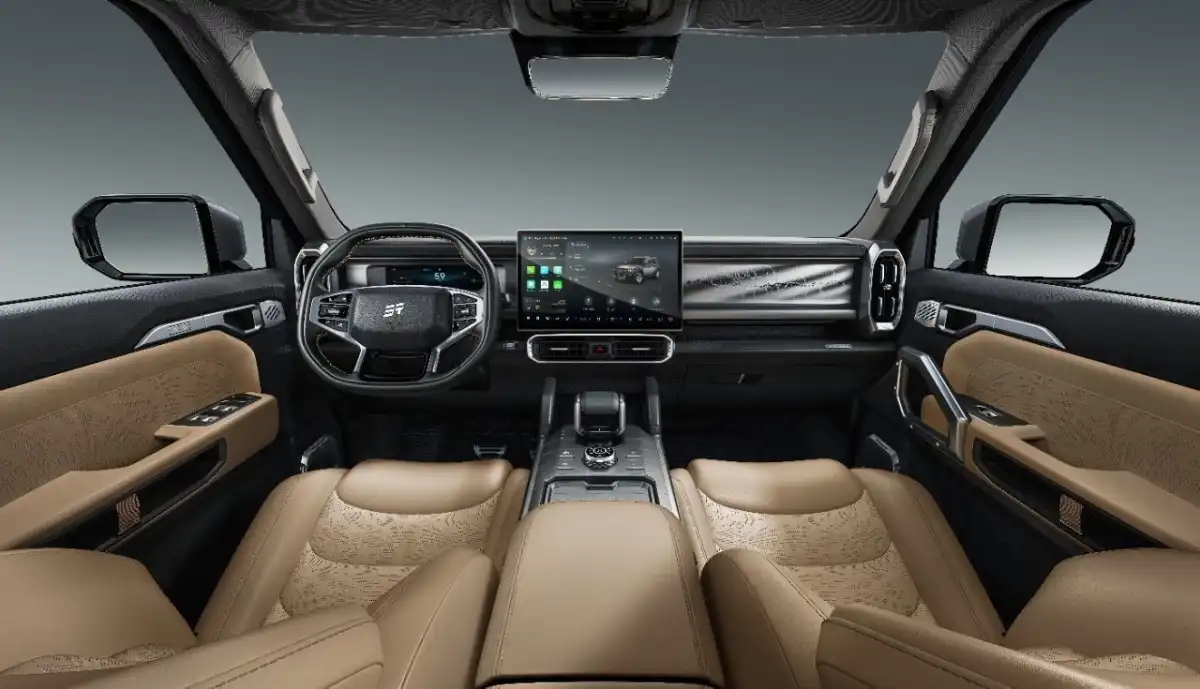 كابينة قيادة مترفة مع مواد فاخرة كالجلد والخشب.