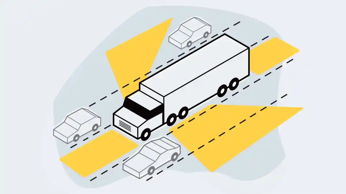 الشاحنات الكبيرة لديها نقاط عمياء كبيرة حيث يمكن لمركبتك الصغيرة أن تختفي عن رؤية سائق الشاحنة. يُشار إلى هذه المناطق غالباً بـ "المناطق المحظورة" (No-Zones).