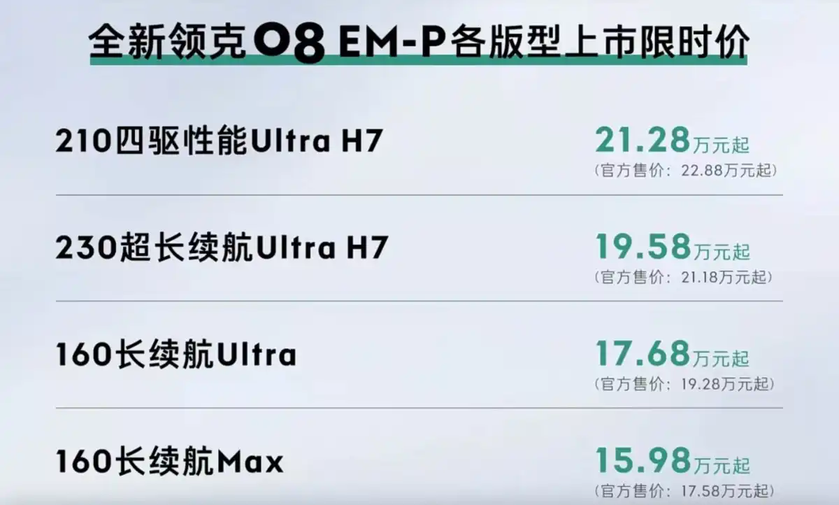 أطلقت جيليالإمارات جيلي البحرين جيلي مصر جيلي السعودية جيلي الكويت جيلي عُمان جيلي قطر جيلي نسخة محدثة من سيارة لينك آند كو 08 EM-P رسميًا في 24 سبتمبر 2025، مع تعزيز قدرات القيادة الذاتية باستخدام تقنية LiDAR الجديدة. يأتي هذا SUV الهجين القابل للتوصيل بالكهرباء بأسعار ترويجية تتراوح بين 159,800 و 212,800 يوان (22,200 إلى 29,600 دولار)، مما يجعله خيارًا تنافسيًا للغاية في فئته.