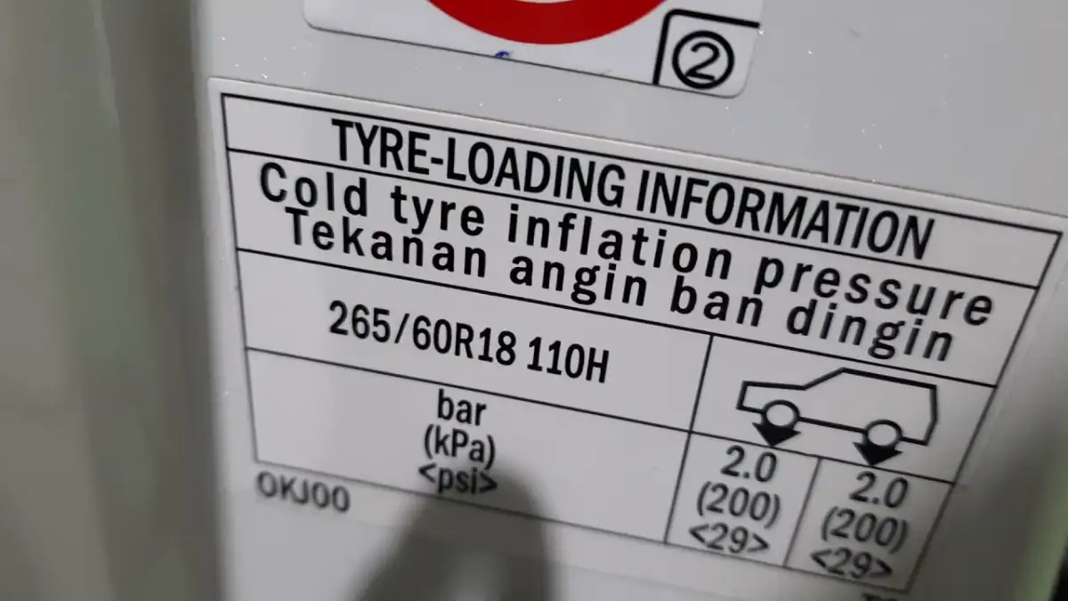 قم بالبحث عن الملصق الموجود على غطاء خزان الوقود الذي يحتوي على قيم الضغط المقررة للإطارات الأمامية والخلفية.